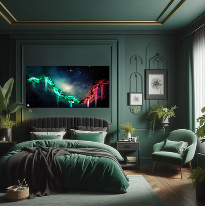 - Découvrez l'envoûtante magie de cette toile, où la saturation multicolore et les coulures se superposent sur un fond "espace" composé de nébuleuses et d'étoiles.Un résultat si captivant qu'il est difficile de détourner le regard. Laissez-vous emporter par cette œuvre envoûtante.