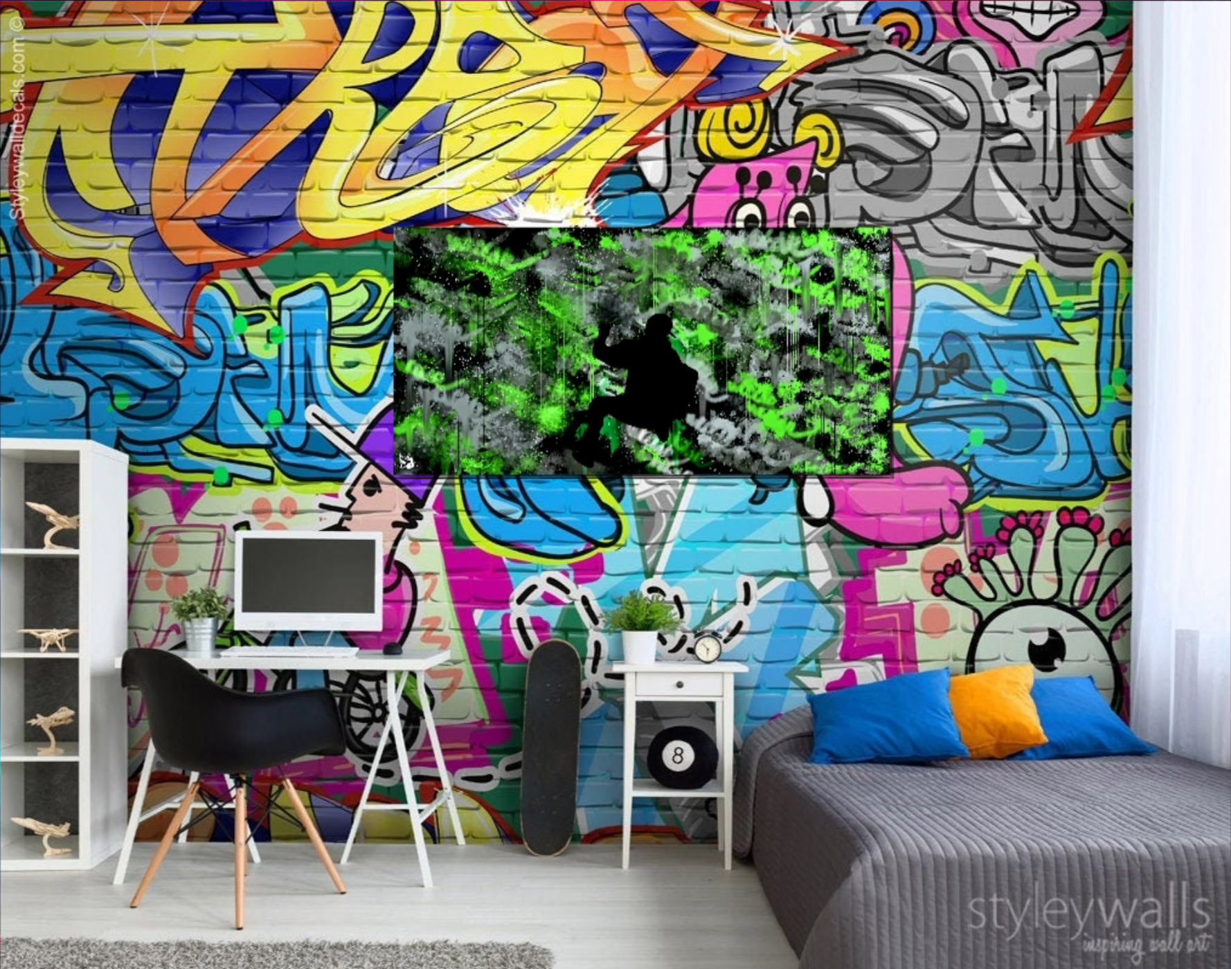 Transformez votre espace de vie avec "Action & Saturation", une pièce audacieuse qui insufflera une dynamique graffiti à votre intérieur et émerveillera vos invités.