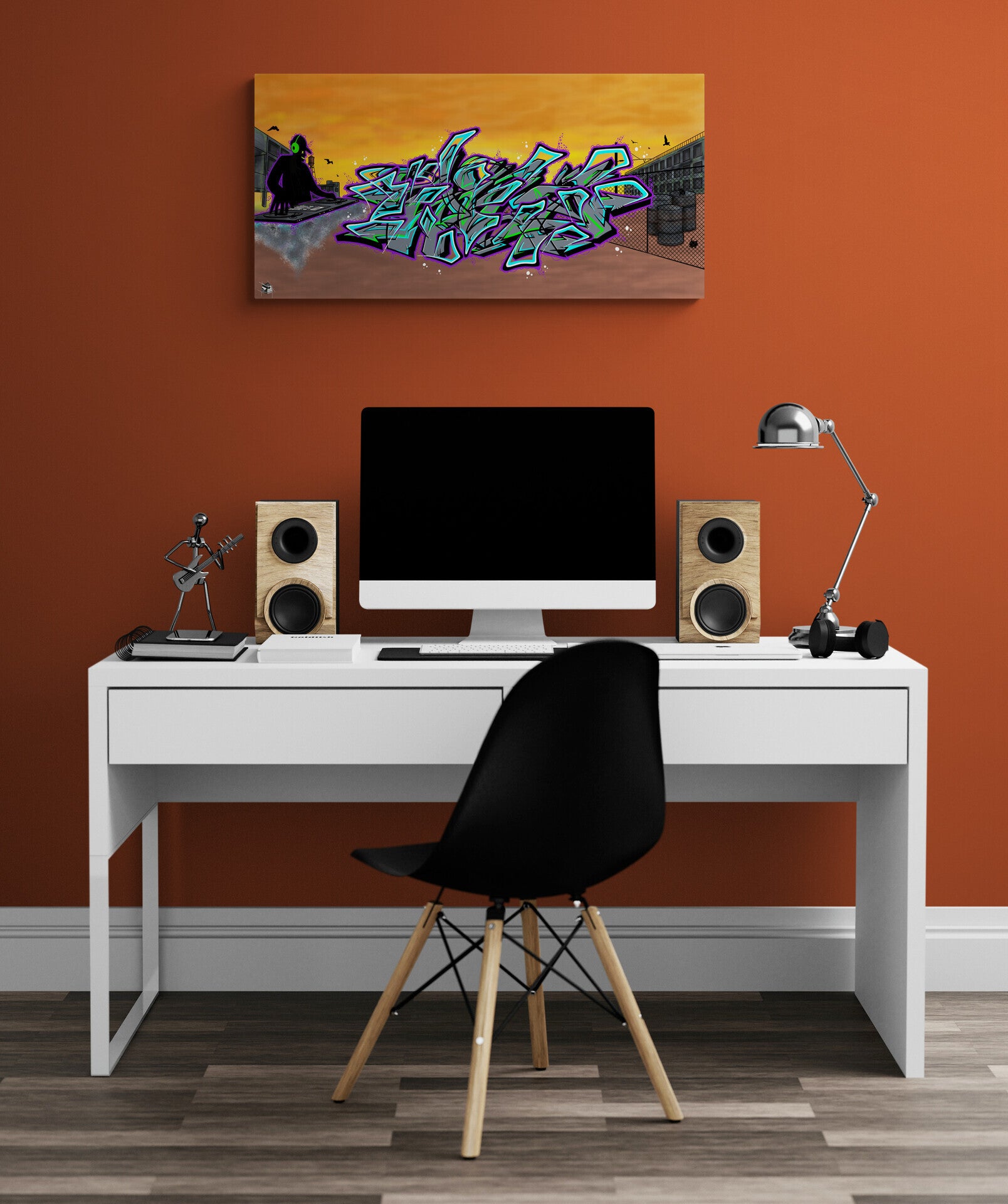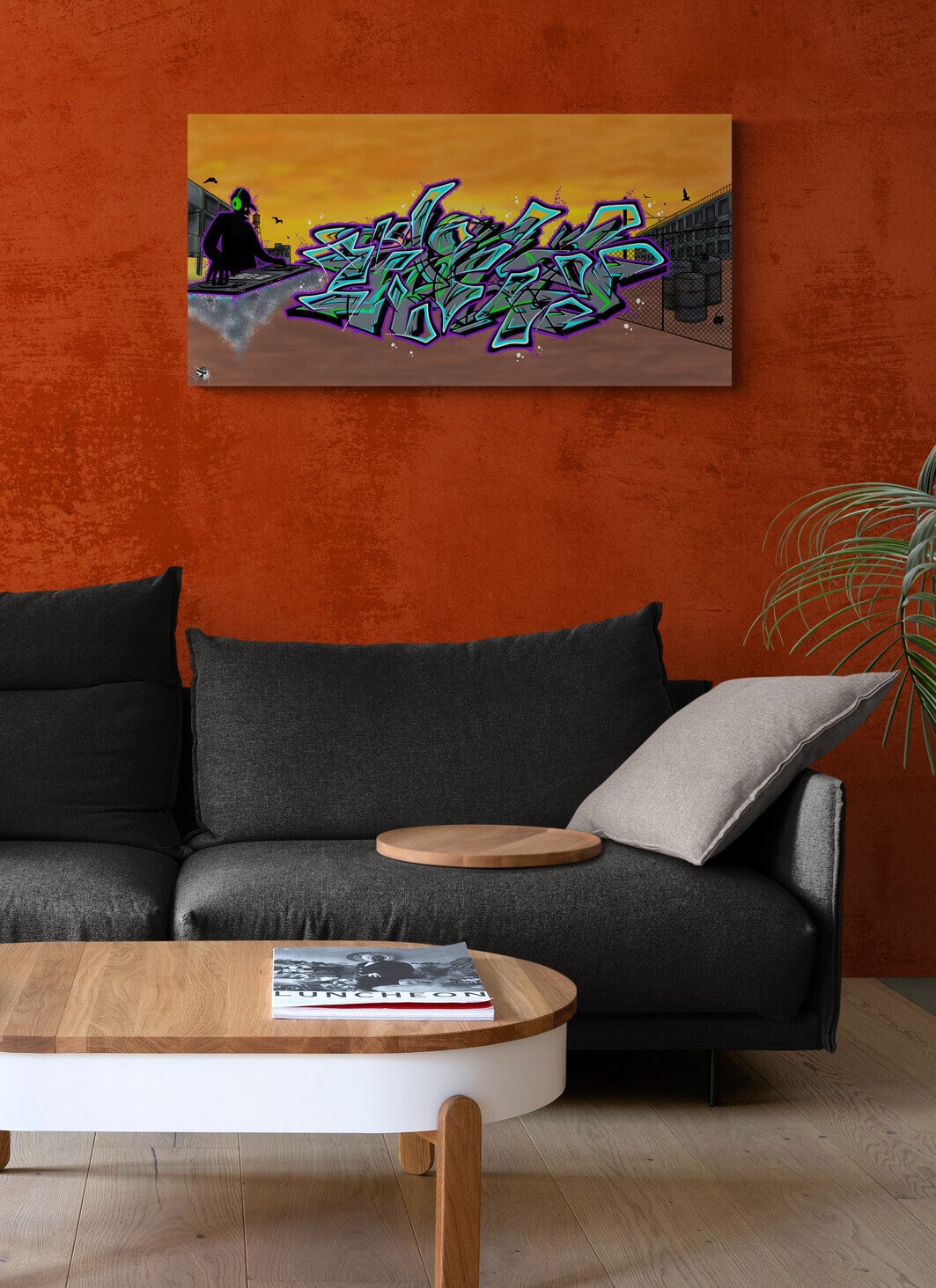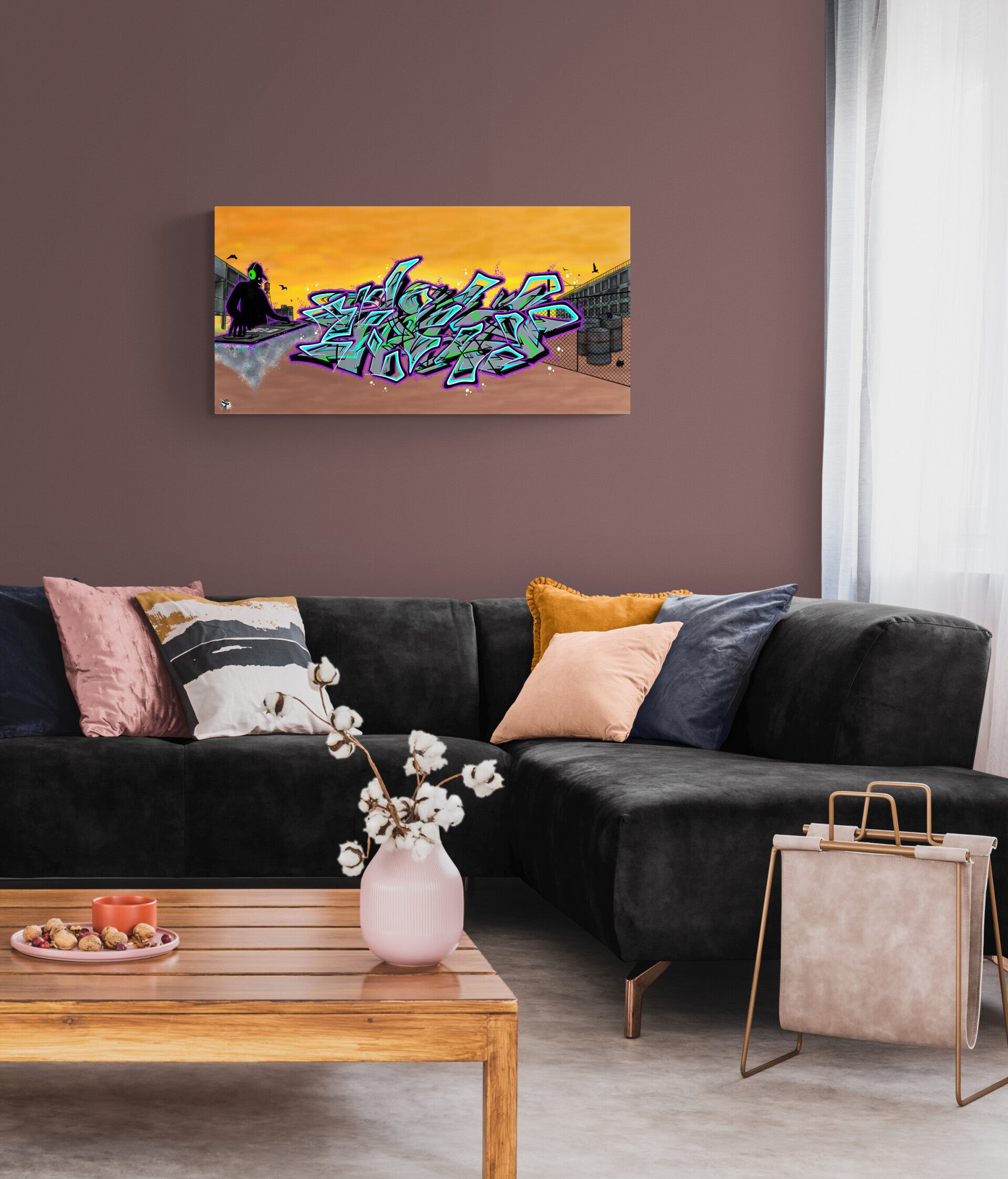 - Sur cette toile vous pouvez découvrir l'illustration d'un DJ en action,accompagné d'un wildstyle graffiti. Pour le fond,un terrain vague avec quelques bâtiments abandonnés,éclairé par un levé de soleil