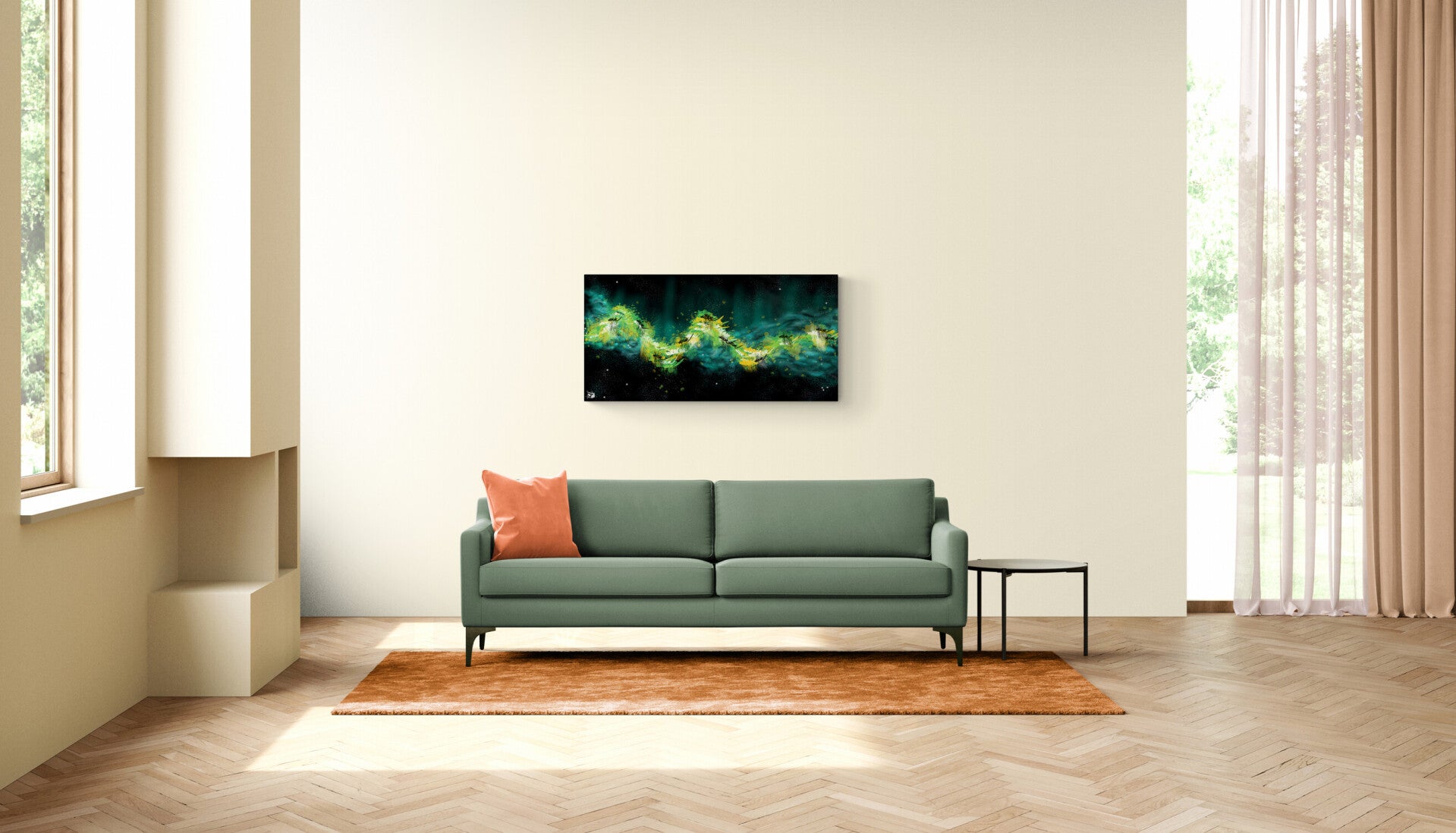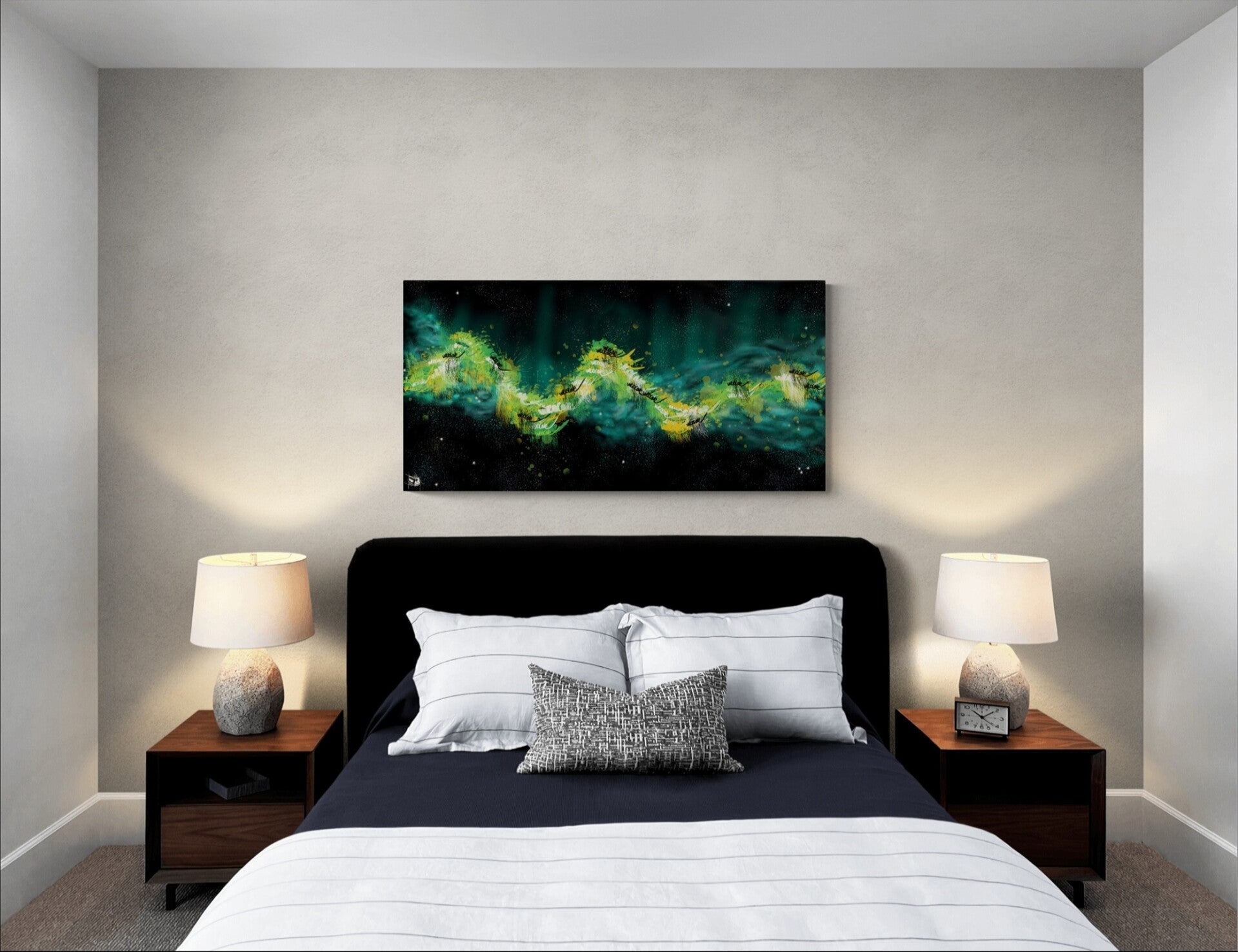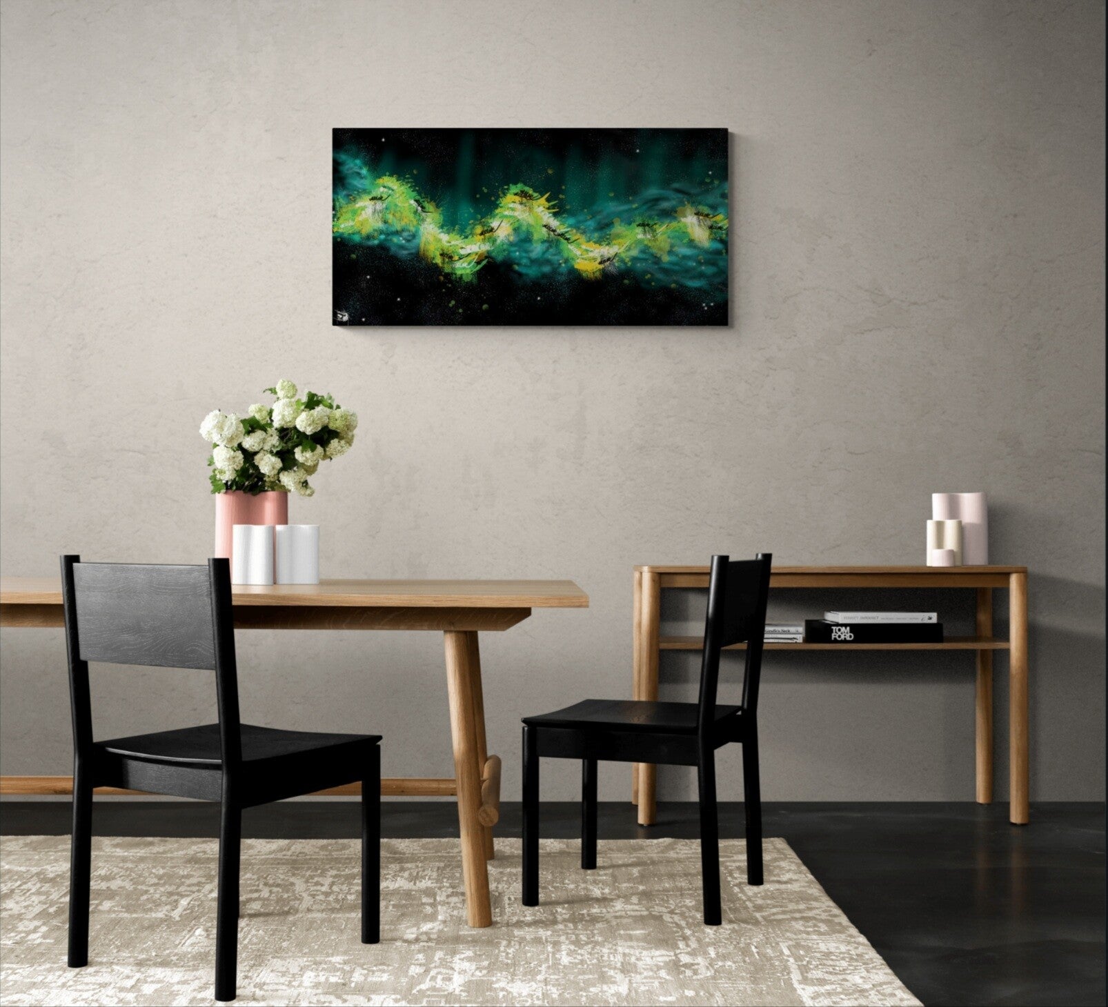 - Laissez-vous envoûter par cette œuvre d'art vibrante, où les nuances de jaune et de vert s'entrelacent avec des touches de blanc et de noir, illuminant une nébuleuse sombre pour un résultat éblouissant.