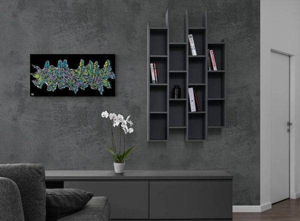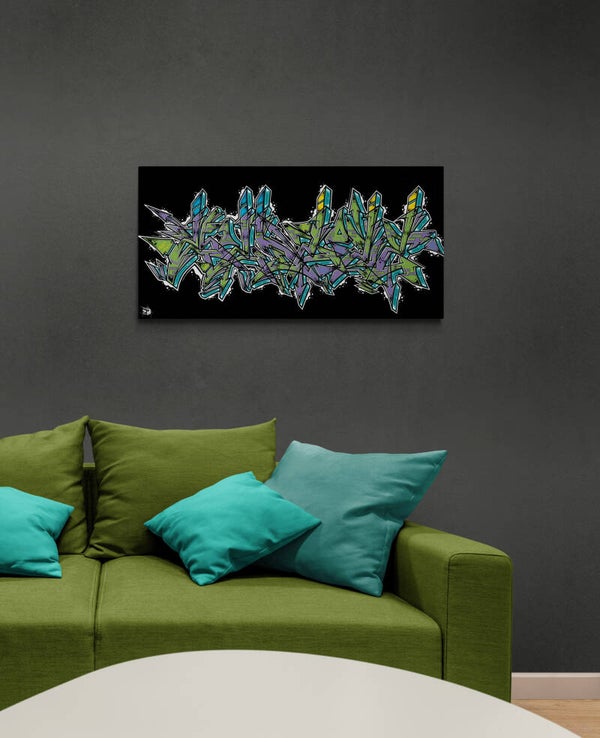 - Toile 100% wildstyle graffiti,ou les couleurs vert,violet et bleu se mélange subtilement poir un résultat captivant.
