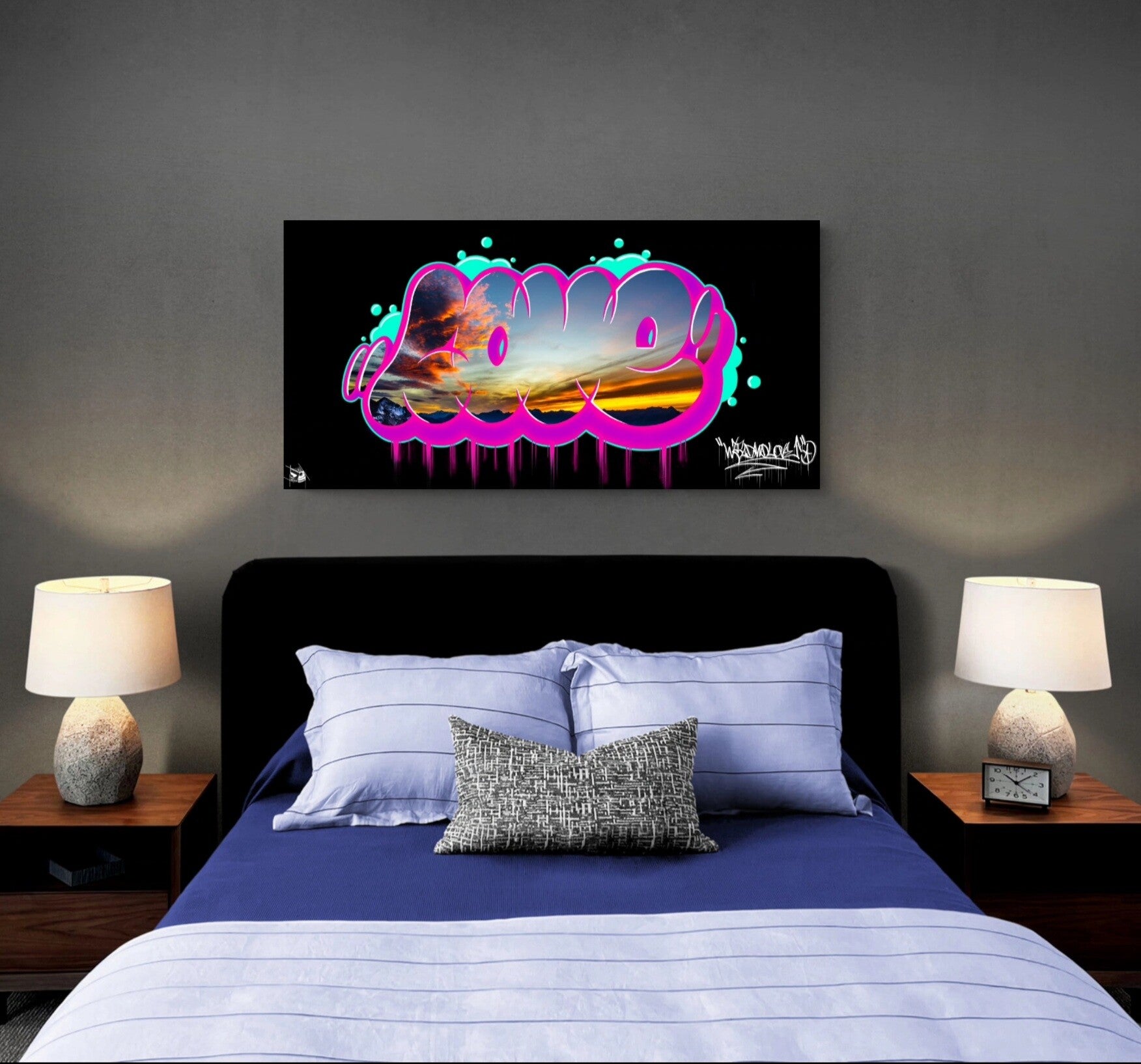 - Plongez dans un univers où le graffiti prend vie, fusionnant l'énergie du street art avec la sérénité d'un coucher de soleil captivant.